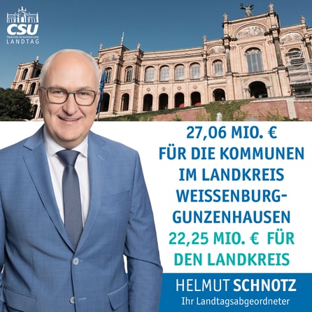 2024-12-05 | Die Kommunen im Landkreis Weißenburg-Gunzenhausen erhalten im kommenden Jahr Schlüsselzuweisungen in Höhe von 27.056.080 Euro. Der Landkreis wird mit 22.253.340 Euro unterstützt. „Der Freistaat gibt damit 2025 fast 775.000 Euro mehr in den Landkreis als 2024. Der Freistaat und die bayerischen Kommunen halten in wirtschaftlich schwierigen Zeiten zusammen. Auf allen Ebenen ist das Geld knapp. Die Schlüsselzuweisungen verschaffen den Kommunen ein wenig mehr finanziellen Spielraum“ betont der Stimmkreisabgeordnete im Bayerischen Landtag Helmut Schnotz (CSU).