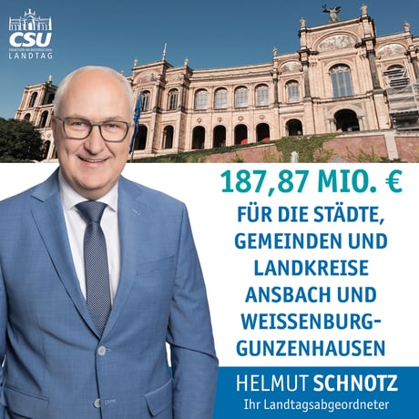 Die Städte und Gemeinden im Landkreis Weißenburg-Gunzenhausen erhalten im kommenden Jahr Schlüsselzuweisungen in Höhe von 26,65 Mio. Euro. Der Landkreis selbst wird mit 22,93 Mio. Euro unterstützt. Insgesamt fließen damit 49,58 Mio. Euro an in die Region. Hinzu kommen 16,51 Mio. Euro – 4,28 Mio. Euro an den Landkreis und 12,21 Mio. Euro an die Kommunen – aus dem Investitionsprogramm der Bundesregierung. „Auch in Zeiten steigender Kosten gilt: Unsere Kommunen können sich auf den Freistaat Bayern verlassen. Die Schlüsselzuweisungen sorgen für Planungssicherheit und geben den Städten und Gemeinden in unserer Region den nötigen finanziellen Spielraum“, betont der Stimmkreisabgeordnete Helmut Schnotz (CSU).