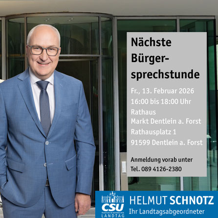 Die nächste Sprechstunde findet am Freitag, 13. Februar 2026 16:00 bis 18:00 Uhr im Rathaus Markt Dentlein a. Forst, Rathausplatz 1, 91599 Dentlein statt.